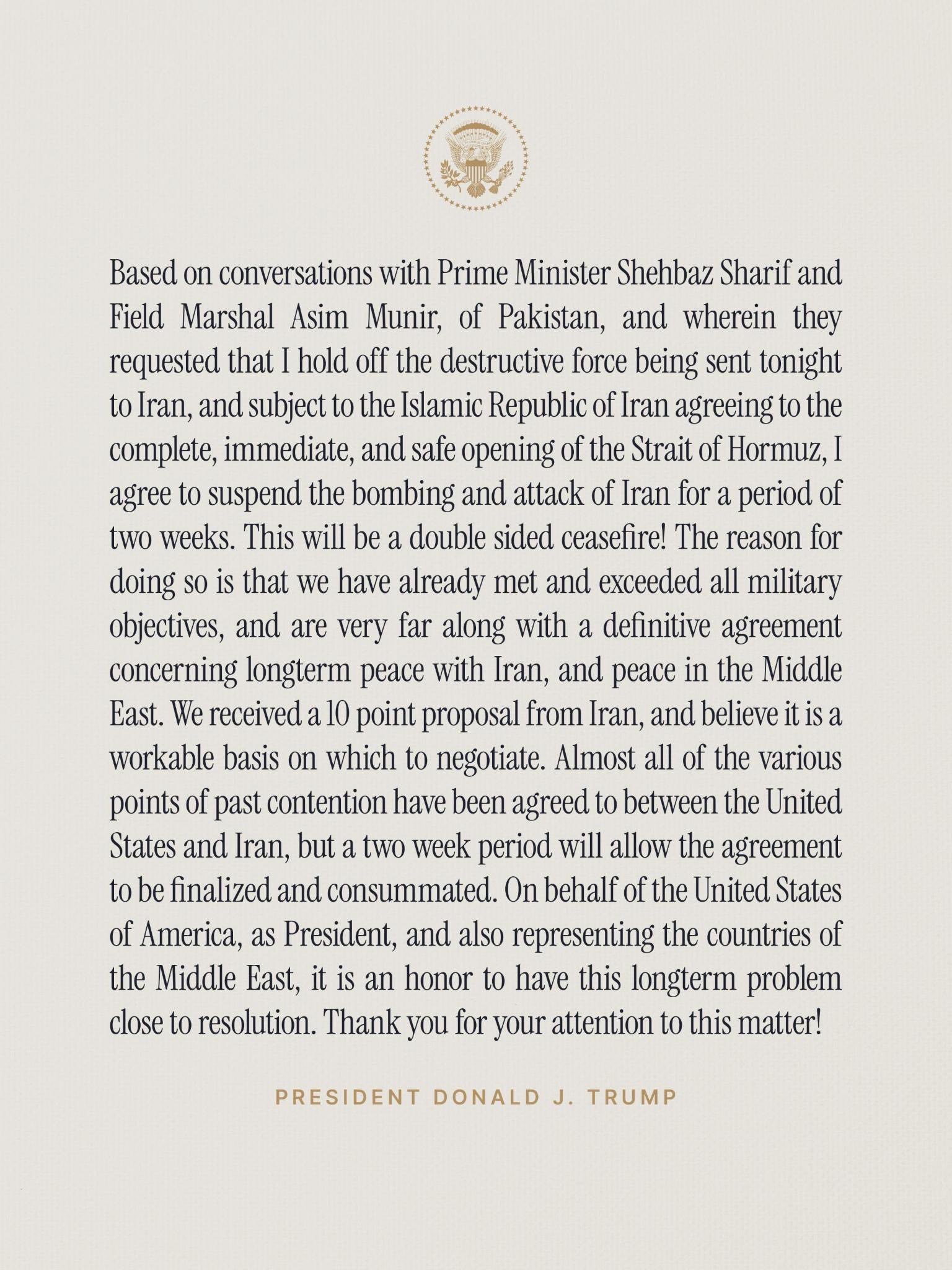 The ceasefire went into effect on Tuesday evening just an hour before the time was to expire on Iran. President Trump announced the ceasefire by posting the announcement on a White House memo. (see below)
