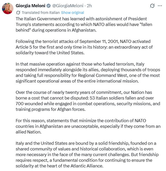 Many of the NATO partners responded to the President’s comments, stating that they sent in their special operations units to work side by side with U.S. SOF. They countered that the NATO allies did take significant casualties during the 20-year long conflict. The U.S. lost 2,402 service members in Afghanistan according to DoD. In total, non-US NATO member and other partner nations lost almost 1,200 military personnel. Some of the highest numbers were from the UK (437), Canada (150), France (90), Italy (53), and Denmark (44). (sources differ on the exact counts per country) Trump’s remarks brought swift reactions from many of the NATO countries like United Kingdom, Italy, and others.