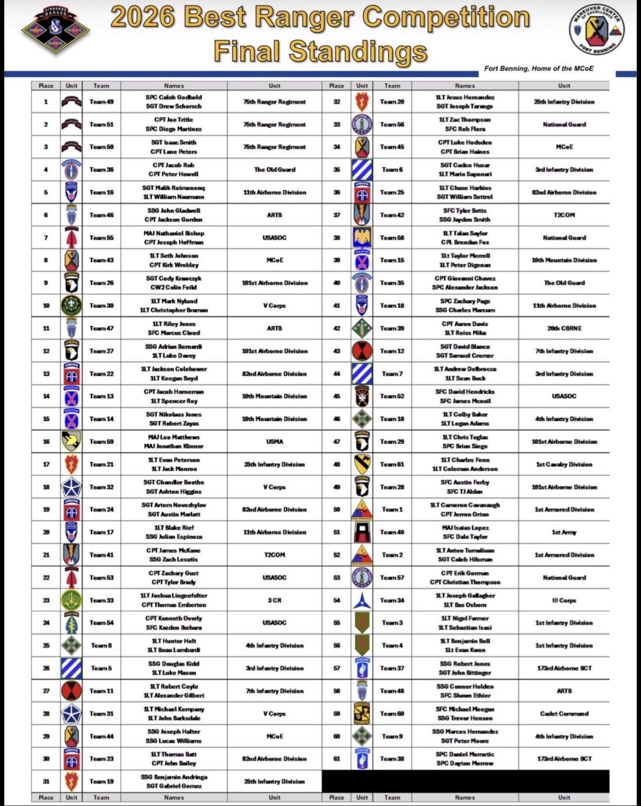Best Ranger Competition. 2026 Best Ranger Winners: Congratulations to Sgt. Drew Schorsh and Spc. Caleb Godbold, representing the 75th Ranger Regiment. Over sixty two-man teams competed. Check out the rankings.