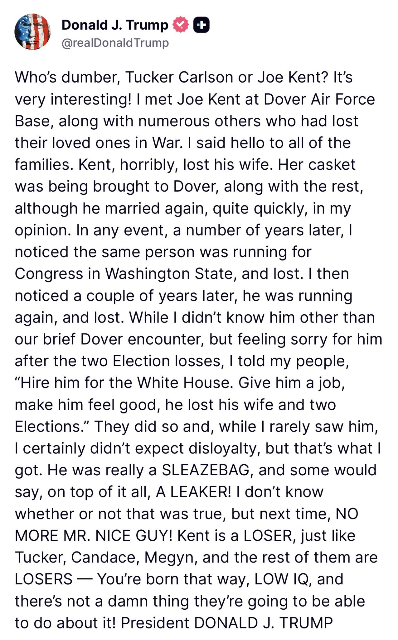 Trump Remarks about Joe Kent. The former Director of the National Counterterrorism Center, Joe Kent, resigned on March 17, 2026. He resigned in protest (Kent letter) against the Trump administrations decision to initiate war with Iran, stating that Iran posed no imminent threat. Kent is a retired Green Beret. On Thursday, April 16, 2026, President Trump posted some very unflattering remarks (Trump remarks) about Kent on Truth Social.